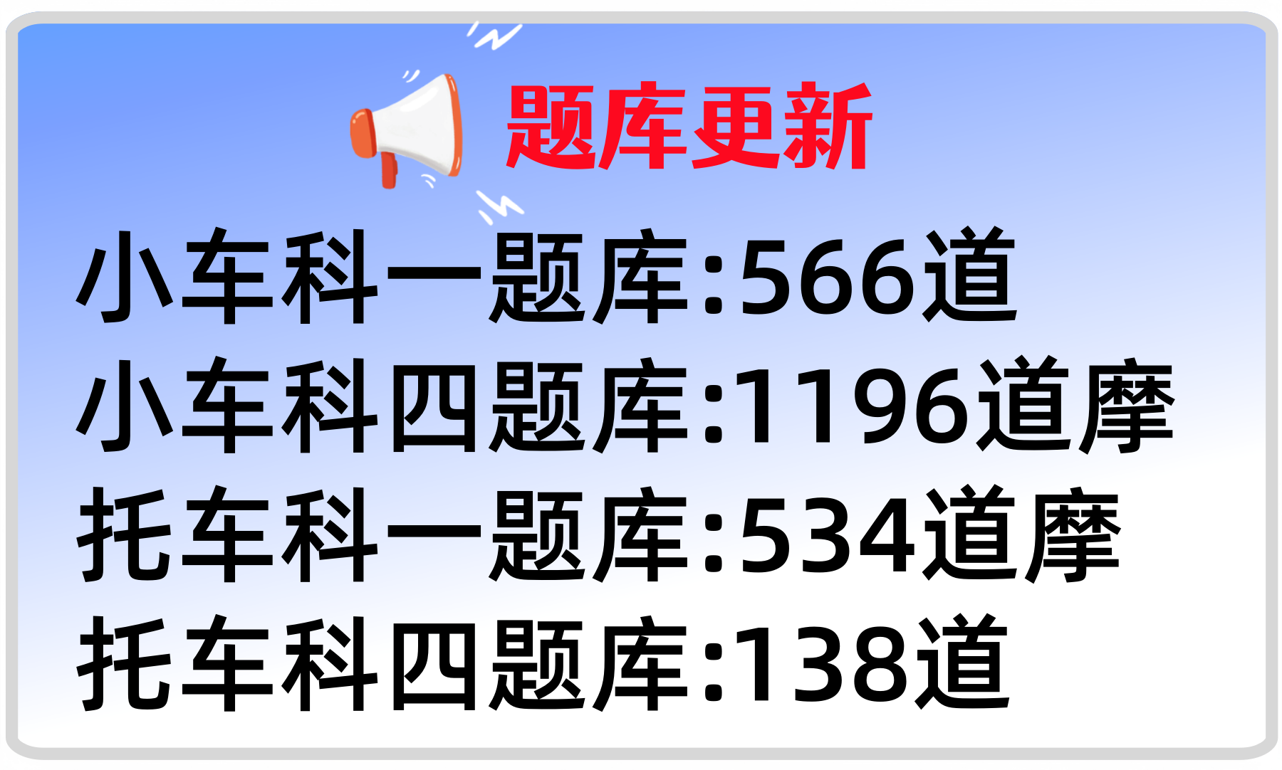 2026年4月25日:摩托车删除老题4道、新增3道,摩托车科目四新增加12道。题库自动更新不需要重新下载。因为我们只做交规软件,所以题少、题真、更新的快。